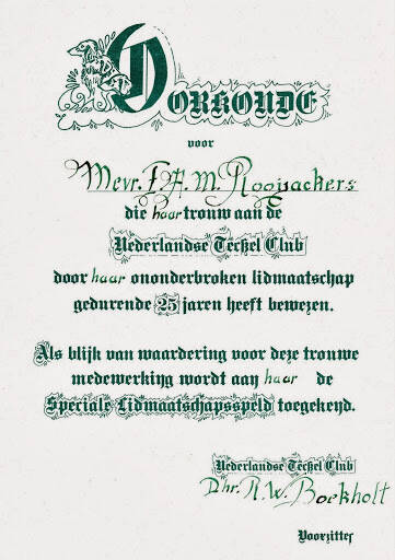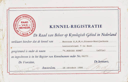 Mijn kennelnaam is "Van Rodies Home". Ik heb een kennelregistratie bij de Raad van Beheer sinds 1986 en ben dan ook al sinds 1985 lid van de Nederlandse Teckelclub. Jaja en heb met 25 jaar lidmaatschap een oorkonde en een mooie speldje gekregen. Het allerbelangrijkste vind ik dat mijn teckeltjes gezond opgroeien, een goed karakter hebben en het naar hun zin hebben.